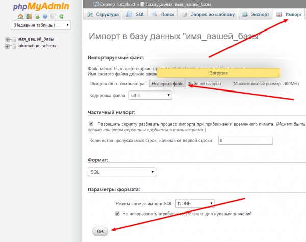 2.3 Создаем базу данных на хостинге, если еще не создана. По данному вопросу вам стоит обратиться в техподдержку, поскольку на разных хостингах процесс создания базы может различаться. 2.4 Импортируем базу (ту, котоую вы экпортировали) на хостинг. Для этого также как при экпорте переходим в вашу базу, только уже на хостинге, жмем на вкладку импорт загружаем sql файл и жмем OK