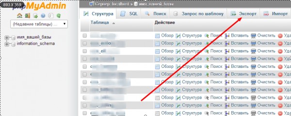 2.1 Экспорт базы данных. Сделать экспорт можно через phpMyAdmin. В Денвере он находится по адресу http://localhost/Tools/phpmyadmin. Переходим туда и выбираем вашу базу данных